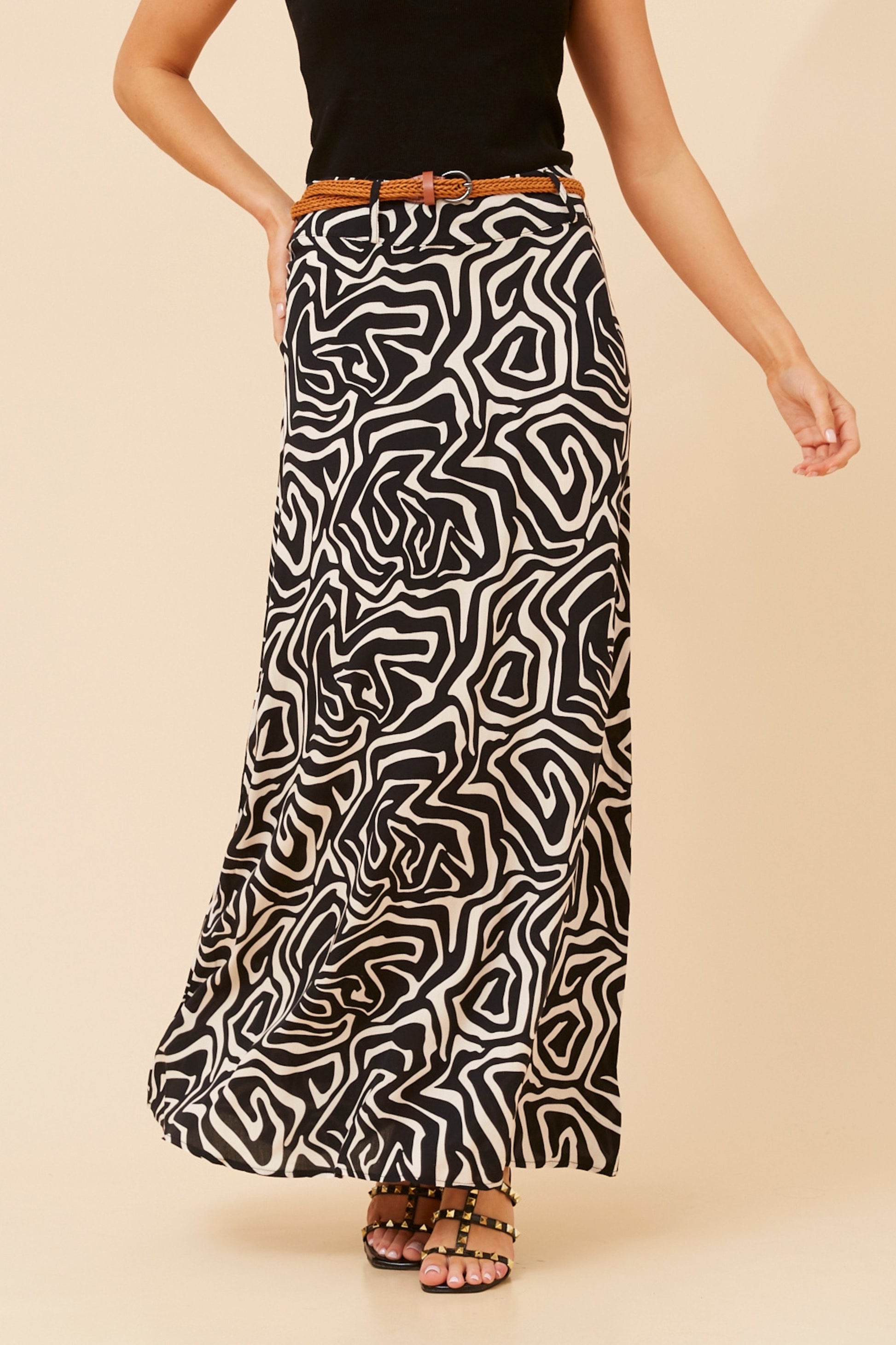 The Amelia Maxi Skirt features a flattering A-line silhouette in a striking abstract print. Designed with a comfortable waistband and belt for easy styling, it also includes a back zip. This unlined maxi skirt offers a regular fit that moves beautifully, making it perfect for effortless everyday wear or dressing up for special occasions.