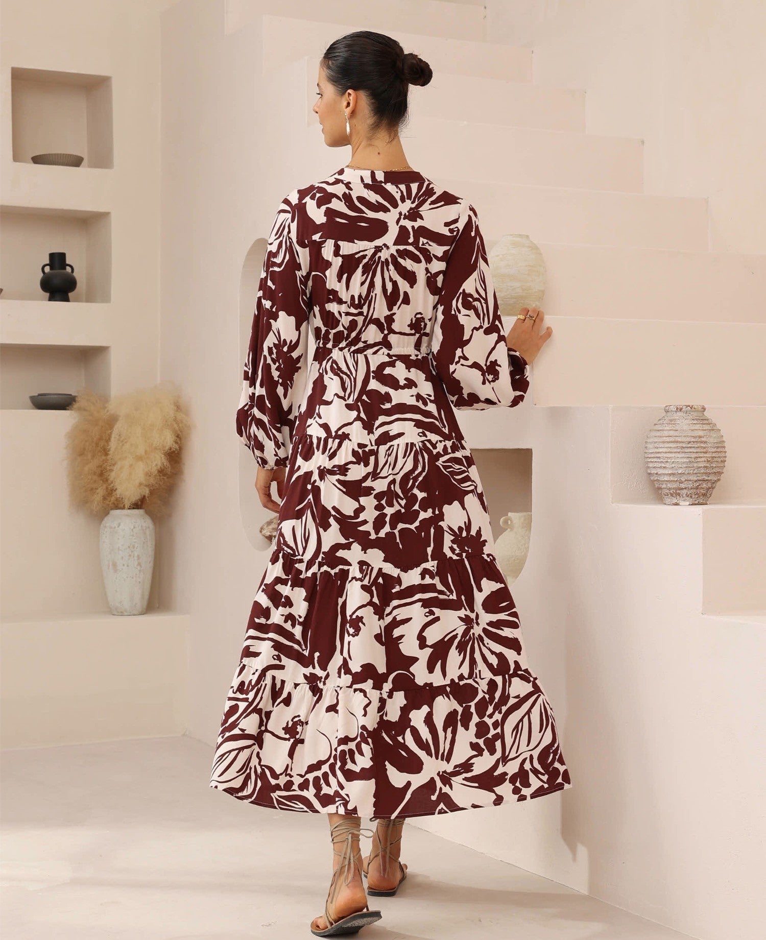 This cheerful Heidi Maxi Dress in rich burgundy floral print features a lightweight rayon fabric for comfortable wear. Designed with elastic cuffs, an adjustable drawstring waist, and a flattering V-neck, it combines style and ease. The button-down front and 30cm front split add playful movement to your look, making it perfect for sunny days and breezy evenings alike. Stay true to size.
