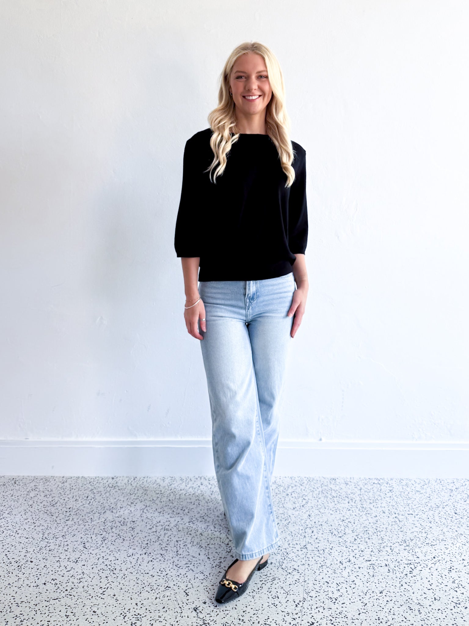 The Lainy Knit Top features a classic boat neckline that flatters any frame. Crafted from sumptuous soft fabric, this piece drapes beautifully while maintaining its shape. The three-quarter sleeves offer the perfect balance between coverage and breathability, making it ideal for layering or wearing solo. A versatile wardrobe essential that transitions seamlessly from day to night.