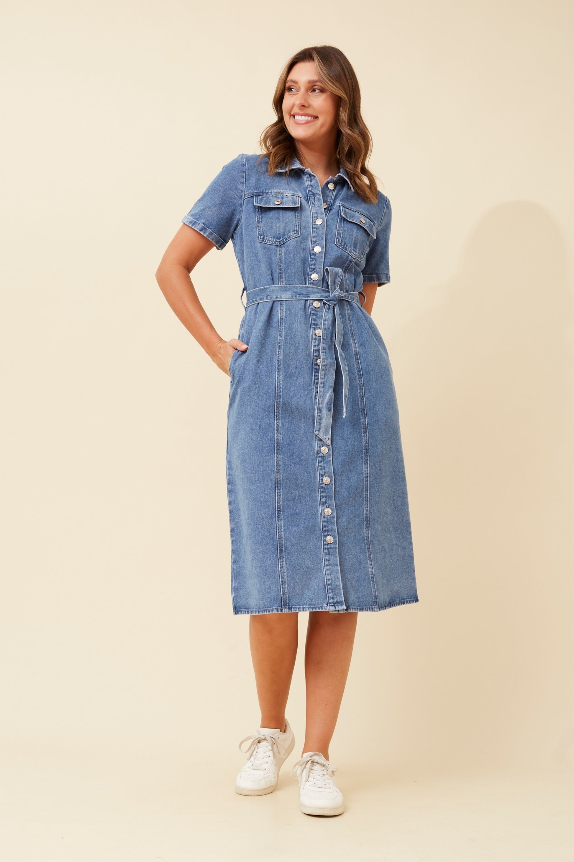 Refresh your denim wardrobe with the effortlessly versatile Loretta Denim Dress in a classic mid denim wash. Designed for easy, everyday styling, this shirt dress is your go to for everything from casual outings to elevated looks.