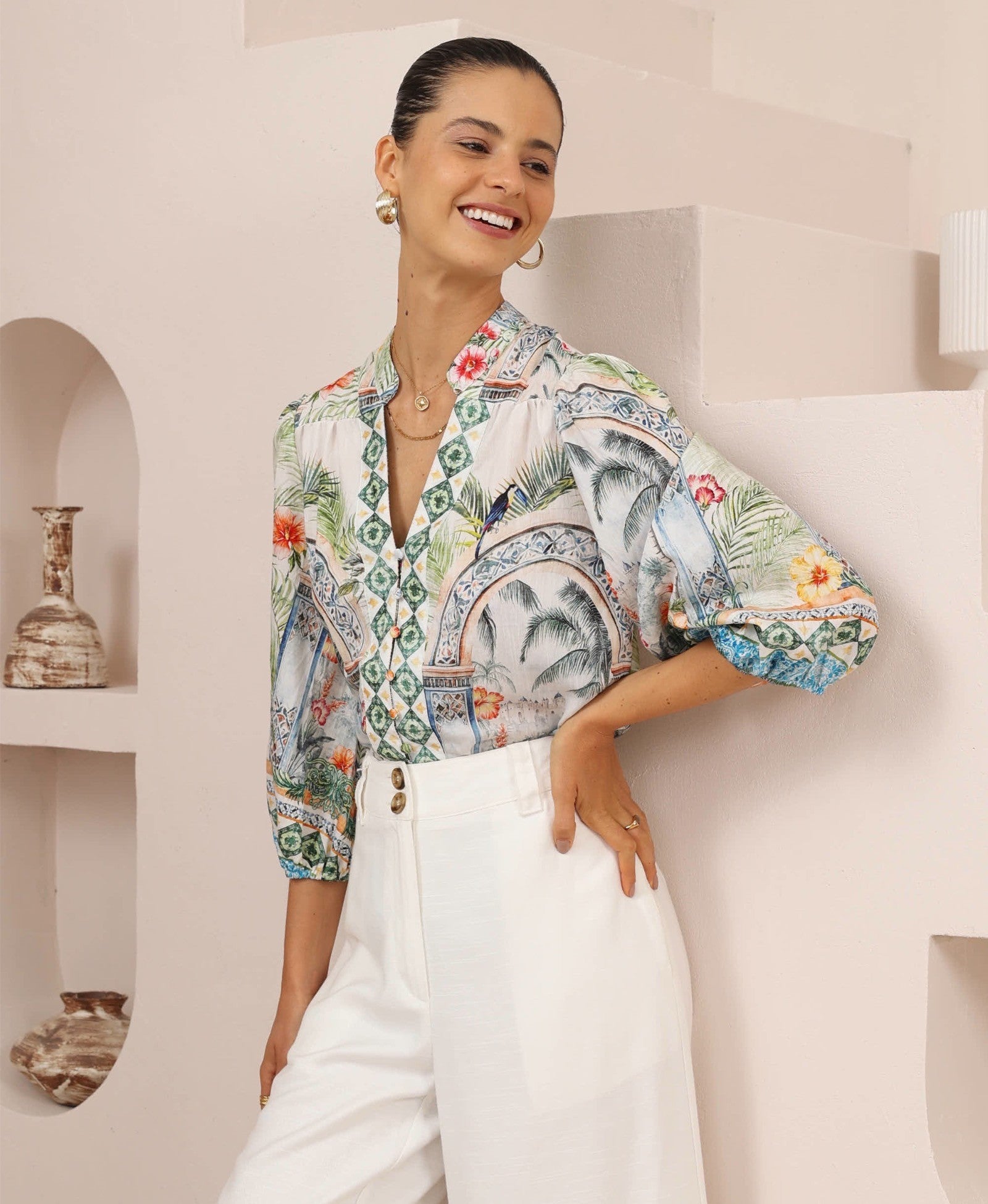 The Vivien Top in Tropicana Print features a v-neckline paired with a delicate mandarin collar for a graceful look. Its button-up front closure adds a classic touch, while elasticated sleeve cuffs offer comfort and subtle shaping. Perfect for breezy days or layered styles, this top blends ease with elegant details. True to size for a more fitted look in the body.
